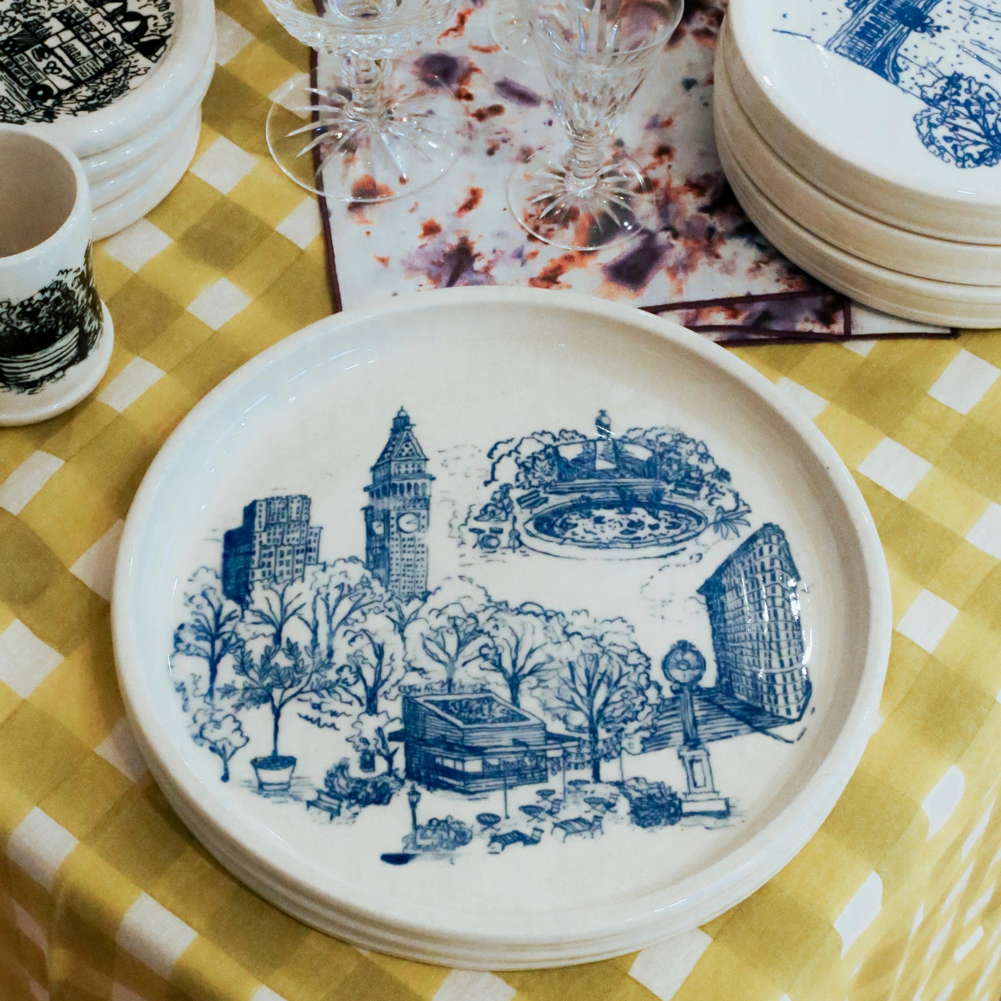 This Flat Iron District platter is worthy of central feature in the home. Hang on a wall, prop up on table, use a platter or dish in the kitchen...It is ready for any and all compliments that come its way featuring the Flat Iron building, the beloved Shake Shack in Madison Square Park and details big and small that capture the beauty and nostalgia of a beloved place. The Flat Iron District Platter is hand-drawn by architect Amanda Iglesias and printed onto hand-thrown porcelain made in the Dear Gloria Design Studio here in New York City.